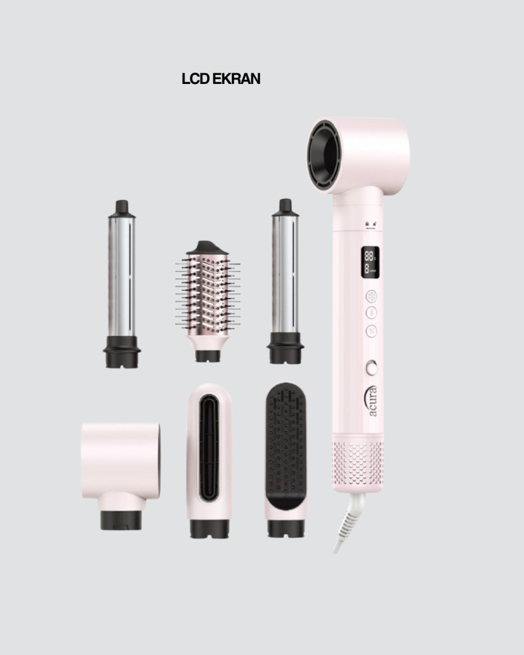 Acura AC-95 Airstyle 6-in-1 Saç Şekillendirme Seti, saç bakım ve şekillendirme rutinini tek bir cihazda toplayarak hem zamandan tasarruf etmenizi hem de profesyonel sonuçlar elde etmenizi sağlar. Gelişmiş motor teknolojisi sayesinde 110.000 rpm motor hızına ulaşan bu cihaz, güçlü fakat kontrollü hava akışıyla saçları kısa sürede kuruturken yüksek ısıya maruz kalma süresini minimuma indirir.Negatif iyon teknolojisi, saç tellerinin kurutma sırasında nemini korumasına yardımcı olur. Bu sayede saçlar daha parlak, daha yumuşak ve daha sağlıklı bir görünüm kazanır. Statik elektrik oluşumunu azaltarak kabarmayı ve uçuşmayı engeller. Özellikle boyalı, işlem görmüş veya ince telli saçlarda gözle görülür fark yaratır.LCD ekran üzerinden sıcaklık ve hız ayarlarını net şekilde takip edebilir, 3 kademeli sıcaklık ve 3 kademeli hız ayarı sayesinde saç tipinize uygun kombinasyonu kolayca seçebilirsiniz. Akıllı ısı kontrol sistemi, saniyede 100 kez sıcaklığı ölçerek saçın aşırı ısınmasını önler ve ısı kaynaklı hasar riskini azaltır.Paket içeriğinde yer alan hızlı kurutma başlığı, hacimlendirici fırça, düzleştirme fırçası, sağa ve sola dönen bukle başlıkları ile oval kurutma başlığı sayesinde tek cihazla birçok farklı saç stili oluşturabilirsiniz. Günlük doğal görünümlerden özel günlerde hacimli ve belirgin buklelere kadar geniş bir kullanım alanı sunar.Soğuk üfleme özelliği, şekillendirme işlemi sonrası saç formunu sabitlemeye yardımcı olur. 350 gramlık hafif yapısı, uzun süreli kullanımlarda bilek ve kol yorgunluğunu minimumda tutar. 2 yıl garanti desteğiyle güvenle tercih edebileceğiniz bu set, evde profesyonel saç şekillendirme deneyimi sunar.