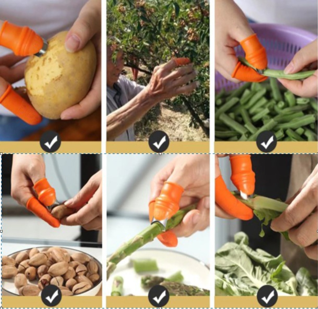 Baş parmak koruyucu soyucu ayıklayıcı kesme eldiveni bahçede, mutfakta sebze meyveleri soymak için kullanılır.Bahçe işlerinizde meyve sebze koparırken parmaklarınızı korur ve kesip koparmanıza yardımcı olurMutfakta sarımsak, sebze ve benzerlerini soymak için kullanılırGiyilebilir kısmı kaliteli silikon malzemeden üretilmiştirM Beden Set Boyutlar: 2.8*4.8*2.1cm Baş Parmak6cm * 1,8 cm 5 Adet Orta Parmak