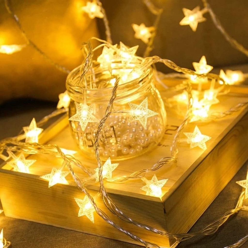 Dekoratif Aydınlatma: Yıldız şekilli 20 LED ampul, 5 metre uzunluğunda kablo üzerinde eşit aralıklarla dizilmiştir.