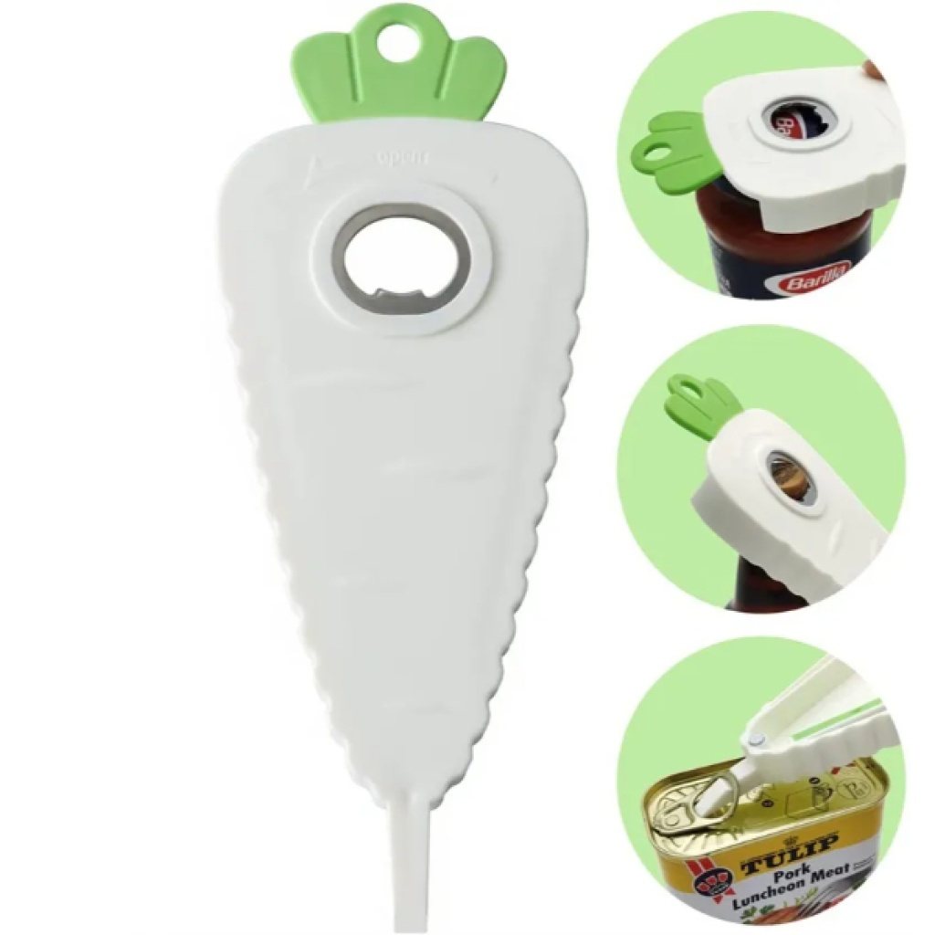 ÇOK FONKSİYONLU KAPAK AÇACAĞIÜrün ÖzellikleriÇok amaçlı kullanım özelliği ile şişe kapakları, kavanozlar, konserve kutuları ve vidalı kapaklar gibi farklı türde kapakları kolaylıkla açabilirsiniz. Ergonomik tasarımı, ele rahatça oturur ve kolay kavrama sağlayarak kullanım sırasında yüksek konfor sunar. Sağlam plastik ve metal bileşenlerden üretilmiş olup, dayanıklılığı ile uzun ömürlü kullanım sağlar. Hafif ve taşınabilir yapısıyla mutfakta, piknikte veya seyahat sırasında yanınızda taşıyarak her ortamda pratik bir çözüm sunar. Havuç, turp gibi çeşitli şekillerdeki eğlenceli tasarımı ile hem şık bir görünüm hem de işlevsellik bir arada sunulur. Yumuşak kenarları sayesinde güvenli bir kullanım sağlar ve kesilme riski oluşturmaz.Not: Ürün farklı desenlerde mevcuttur ve stok durumuna göre karışık gönderilmektedir.Paket İçeriği1 Adet Çok Fonksiyonlu Kapak Açacağı
