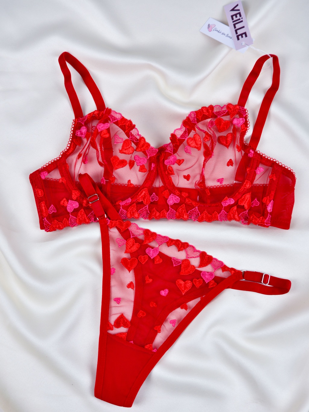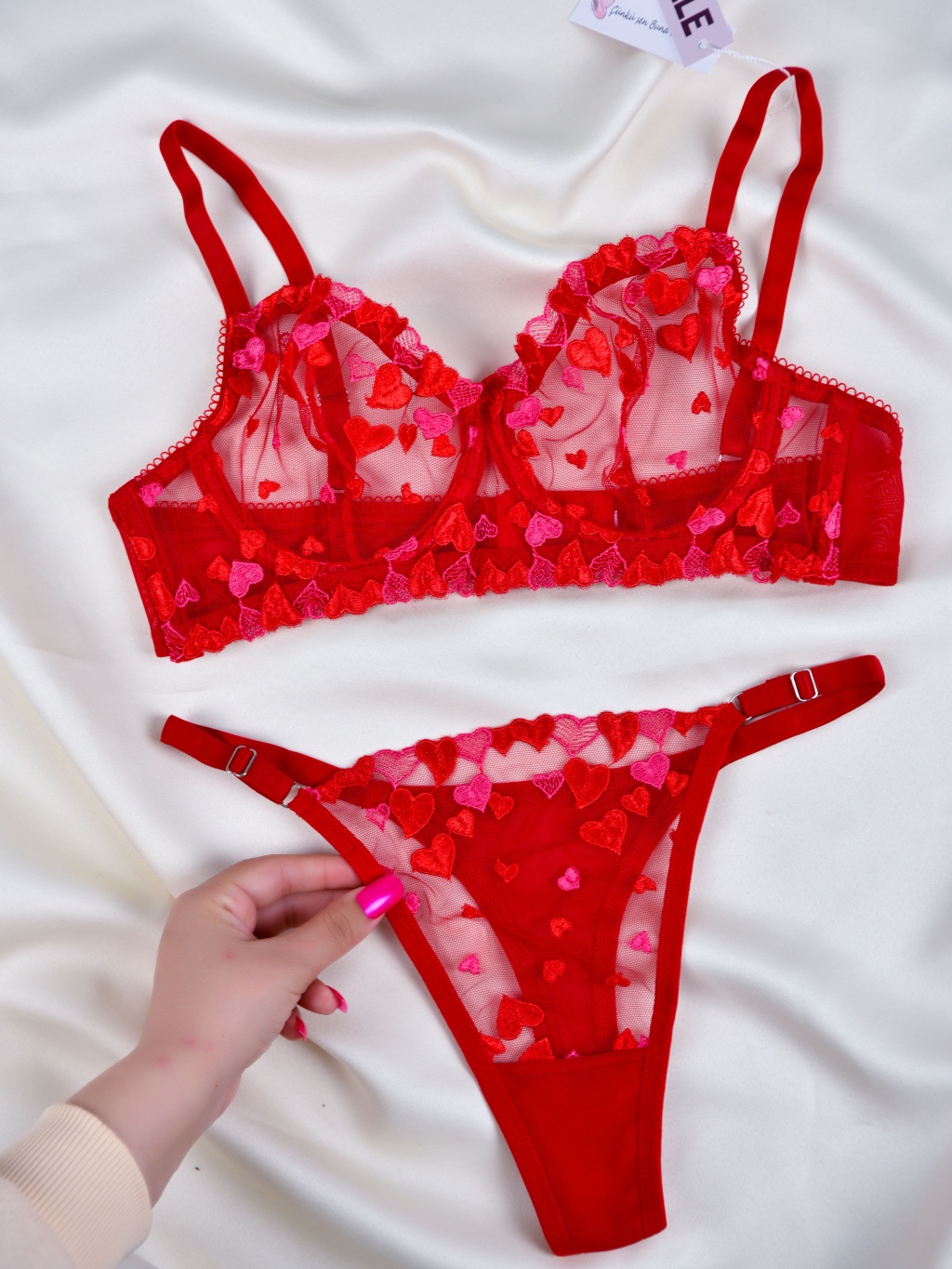 Kadın Kalpli Kırmızı Dantelli Balenli Sütyen Külot Takım