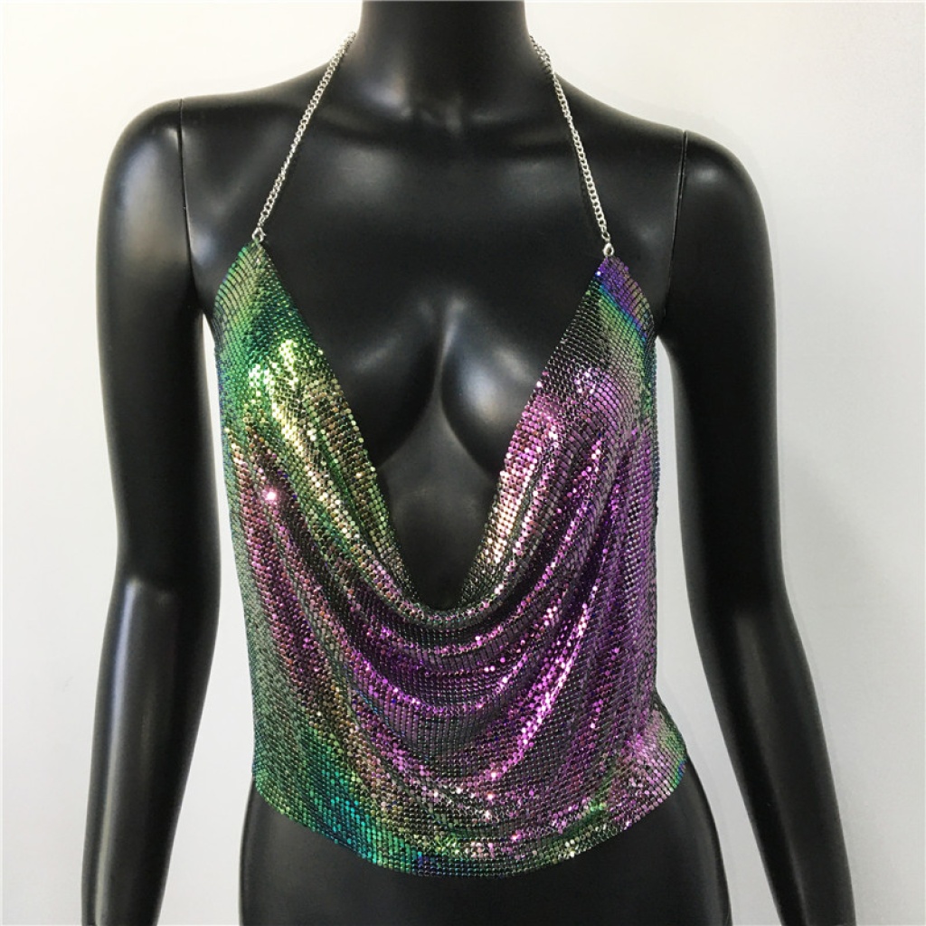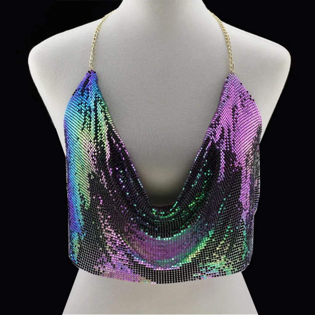 Parlak Gökuşağı Crop & Bluz Kolsuz Kayık Yaka Zırh Büstiyer