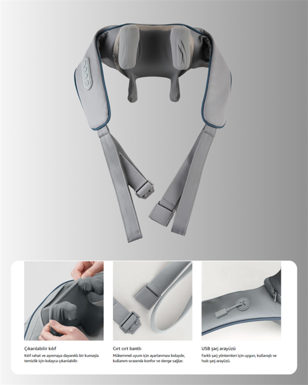 VNB-01, günün yorgunluğunu geride bırakmak isteyen kullanıcılar için özel olarak geliştirilmiş, çok yönlü bir boyun masaj cihazıdır. Sadece boyun bölgesiyle sınırlı kalmadan omuz, sırt, bel ve bacak bölgelerinde de etkili sonuçlar sunar. Gelişmiş teknolojisiyle manuel masajın etkilerini taklit ederek kas düğümlerini çözmekte ve gergin kasları rahatlatmakta son derece başarılıdır.Yoğurma başlıkları, parmak ucu baskısını simüle ederek gerçek bir insan eli hissi verir. Biyonik masaj teknolojisi, kaslara hem yüzeysel hem de derin dokulu basınç uygulayarak etkin bir gevşeme sağlar.Cihazda yer alan iki farklı masaj modu, kullanıcıların günlük ihtiyaçlarına ve fiziksel durumlarına göre seçim yapmasına olanak tanır. Daha hafif mod rahatlatıcı bir deneyim sunarken, yoğun mod derin kas gerginliğini hedef alır. Üç kademeli hız ayarı ile bu modlar özelleştirilebilir.Masaj deneyimini destekleyen bir diğer önemli özellik ise ısı terapisi fonksiyonudur. Cihaz, kasların gevşemesini hızlandıran ısıyı kontrollü şekilde yayarak kan dolaşımını artırır, böylece daha etkili ve kalıcı bir rahatlama sunar.Fırçasız, sessiz motor teknolojisi, hem uzun ömürlü bir kullanım sağlar hem de cihazın sessiz çalışmasına imkan tanır. Özellikle sessiz ortamlarda rahatsızlık vermeden kullanılabilir.1800 mAh bataryası, cihazın şarjlı ve kablosuz olarak kullanılmasına olanak tanır. İster evde, ister iş yerinde, ister araçta kullanıma uygundur. Kutu içeriğinde araç adaptörü de yer almaktadır, böylece yolculuklarda bile kullanım kolaylığı sunar.Ergonomik olarak tasarlanmış U şekli, boyun bölgesini tamamen sarar ve cihazın doğru konumda sabit kalmasına yardımcı olur. Ayarlanabilir askıları, farklı vücut tiplerine uyum sağlar ve kullanım sırasında ellerinizi serbest bırakmanıza olanak tanır.Cihazın kontrolü, yan paneldeki tuşlar sayesinde oldukça basittir. Güç düğmesiyle cihazı açıp kapatabilir, modları değiştirebilir ve hız ayarlarını kolayca yapabilirsiniz.Ürün Teknik Özellikleri: Renk: Gri Batarya: 1800mAh Giriş Voltajı: 5V Güç Tüketimi: 10W Ağırlık: 1290 gram Malzeme: A Kalite ABS Isıtma Özelliği: Var Masaj Modları: 2 farklı mod Hız Seviyesi: 3 kademeli ayar Motor Tipi: Sessiz fırçasız motor Kullanım Alanı: Boyun, omuz, sırt, bel, bacak